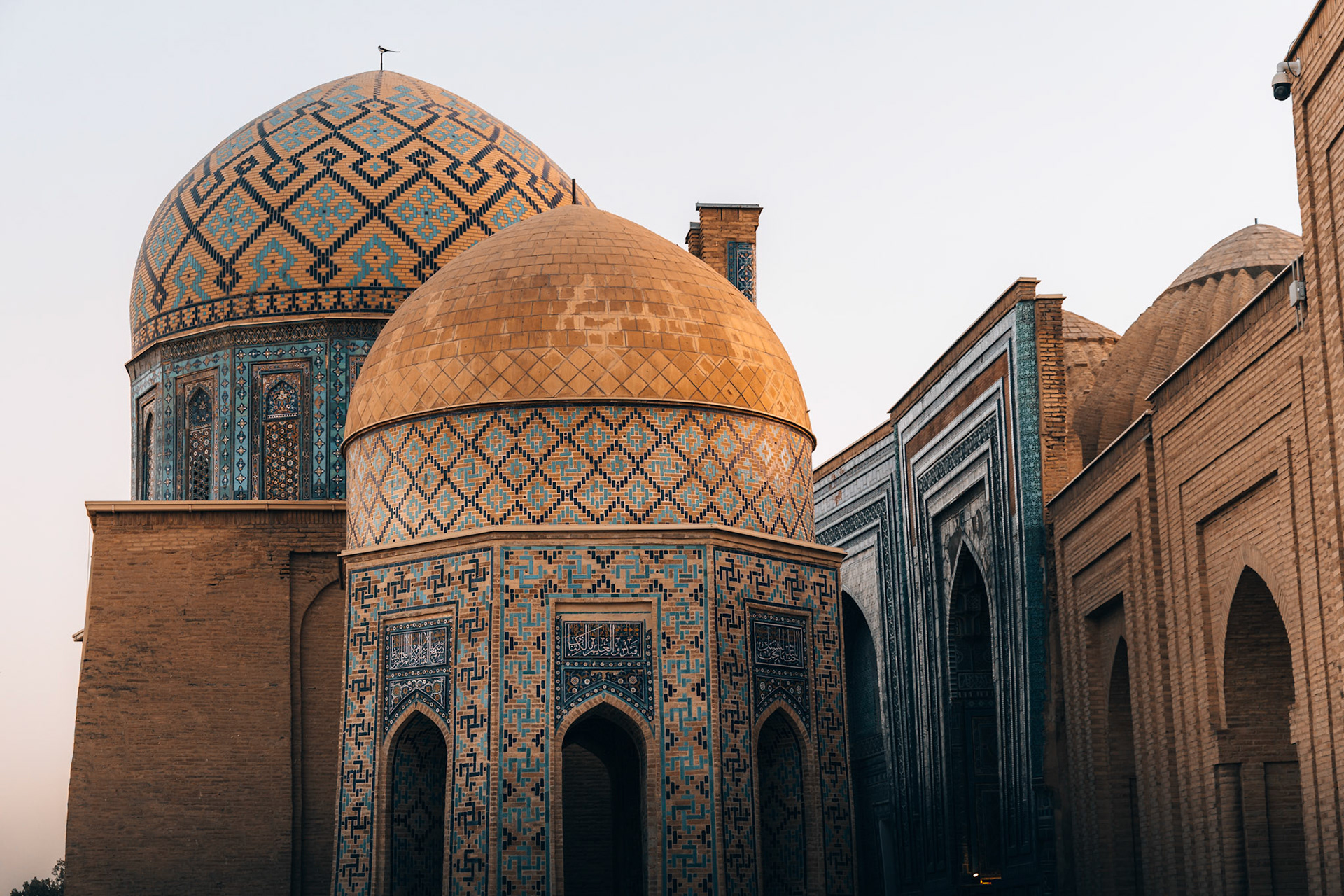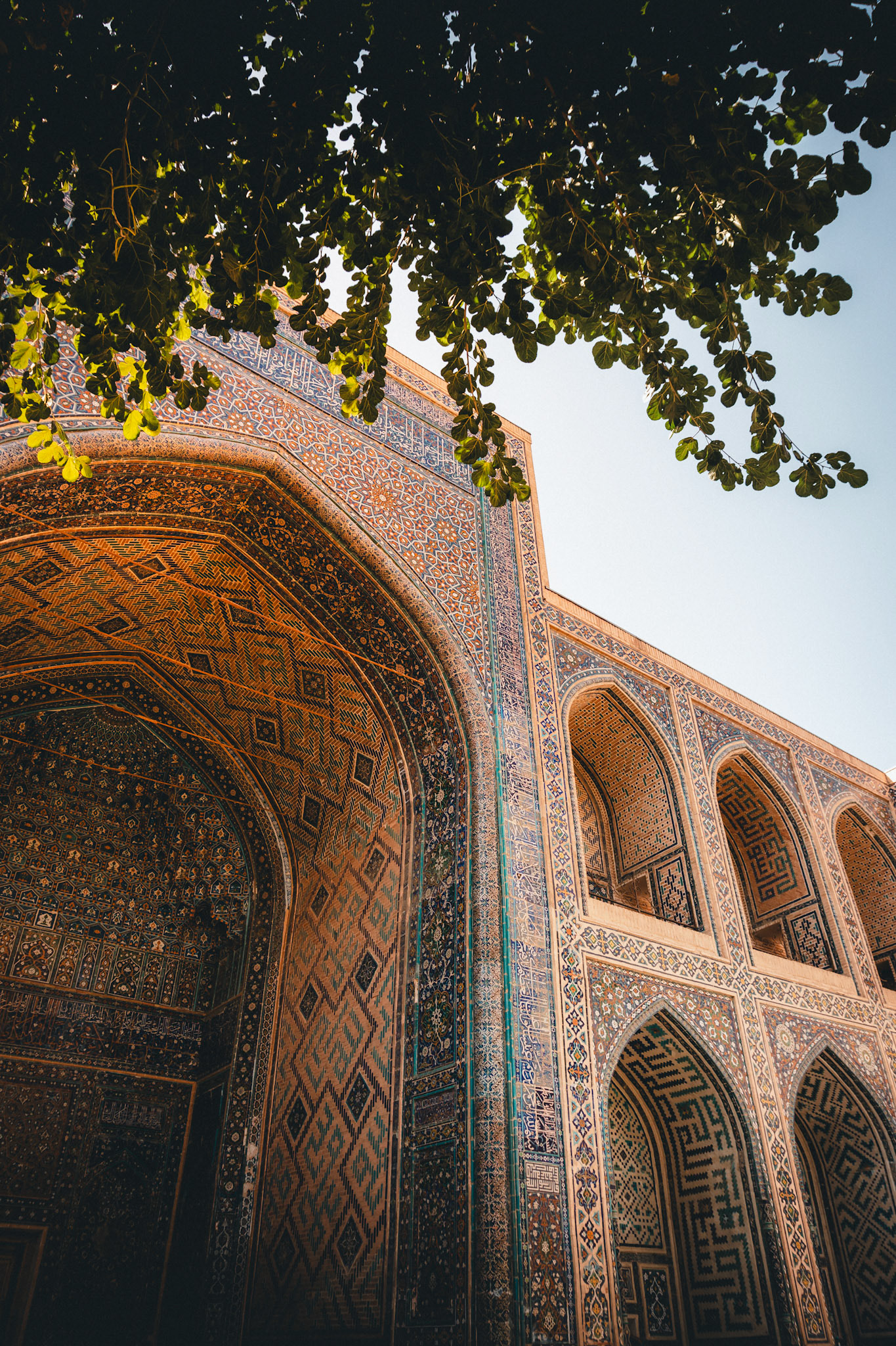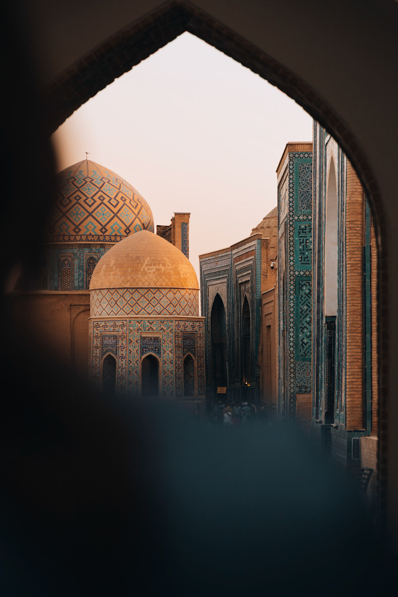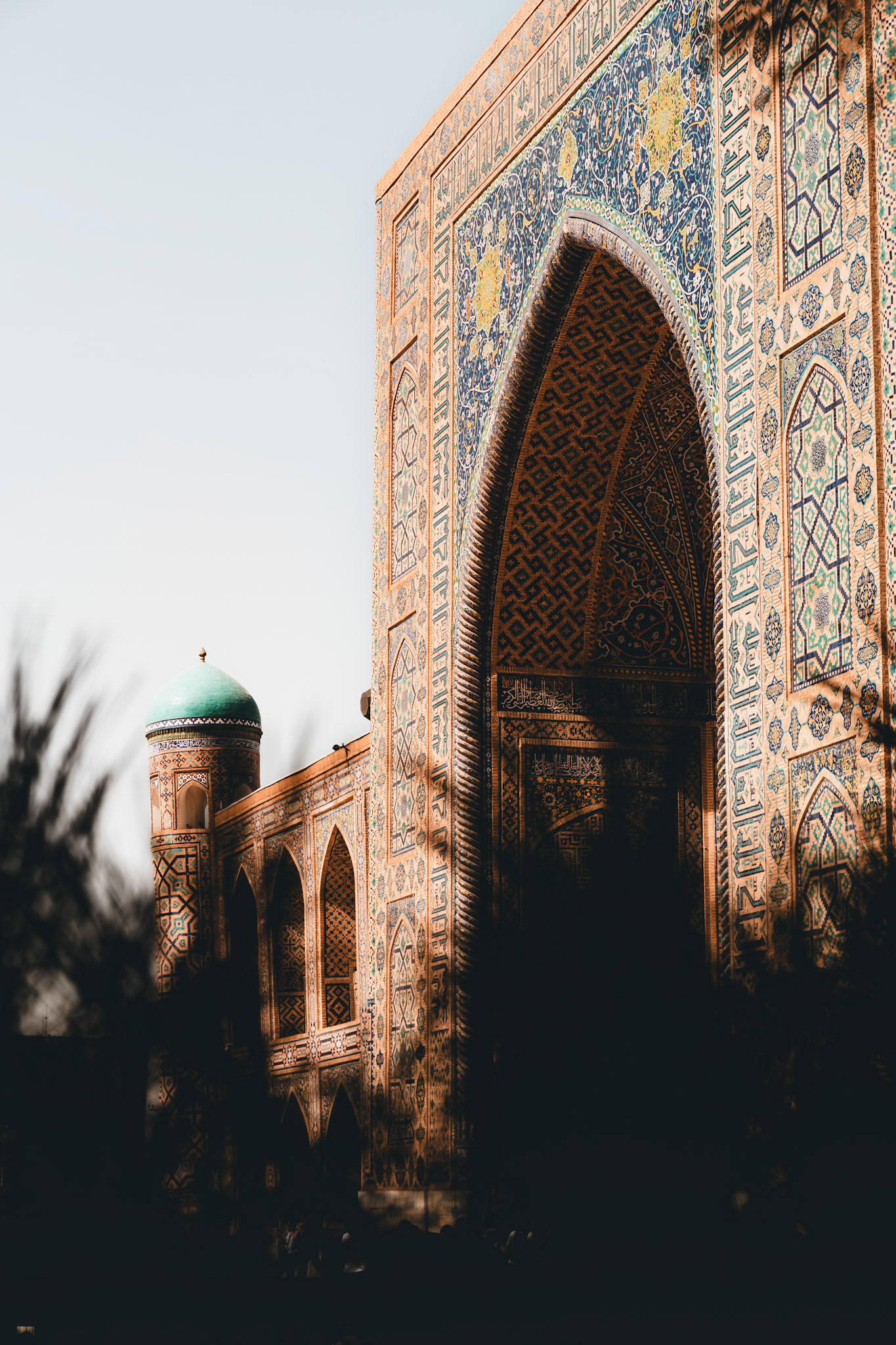 Later die dag dwalen we door Shah-i-Zinda, “de levende koning”. Een smalle laan vol mausolea, waar elke boog en tegel een ander patroon vertelt. Eeuwenoude graven, bedekt met majolica en kalligrafie, weerspiegelen de bloeitijd van de Timuridische dynastie.