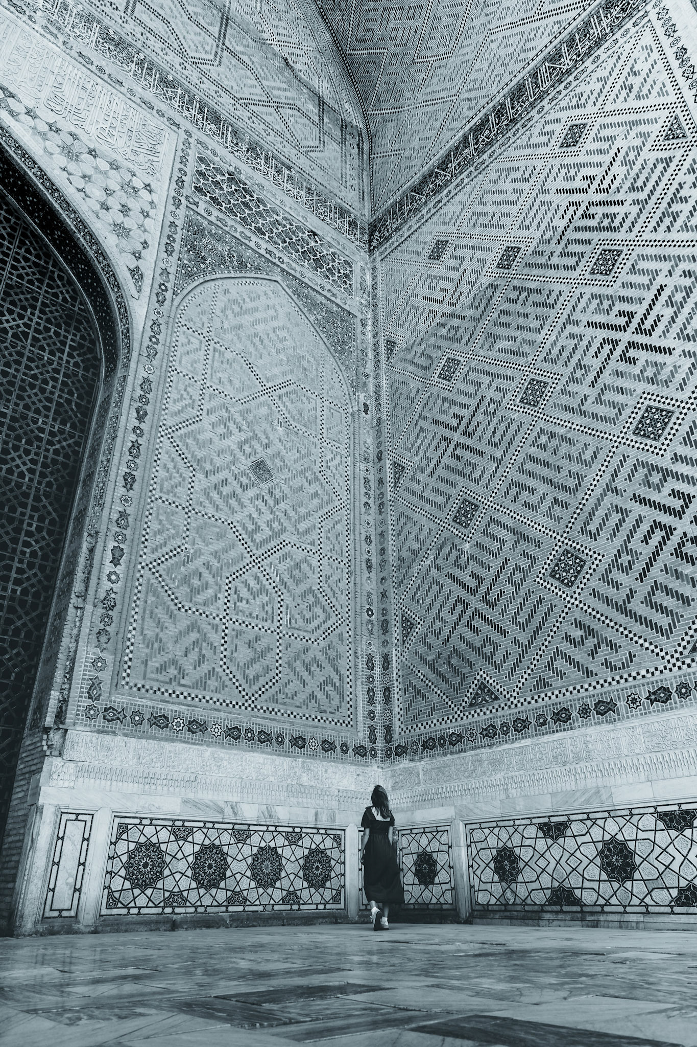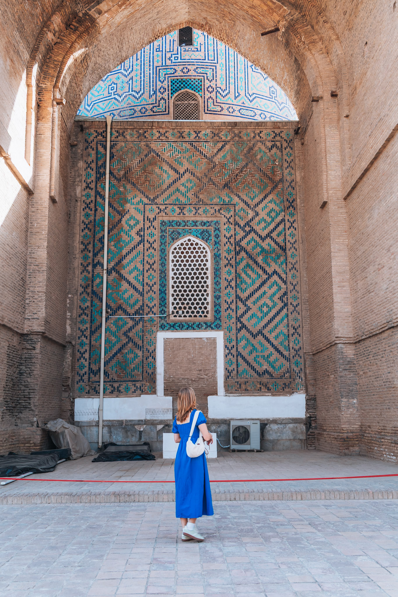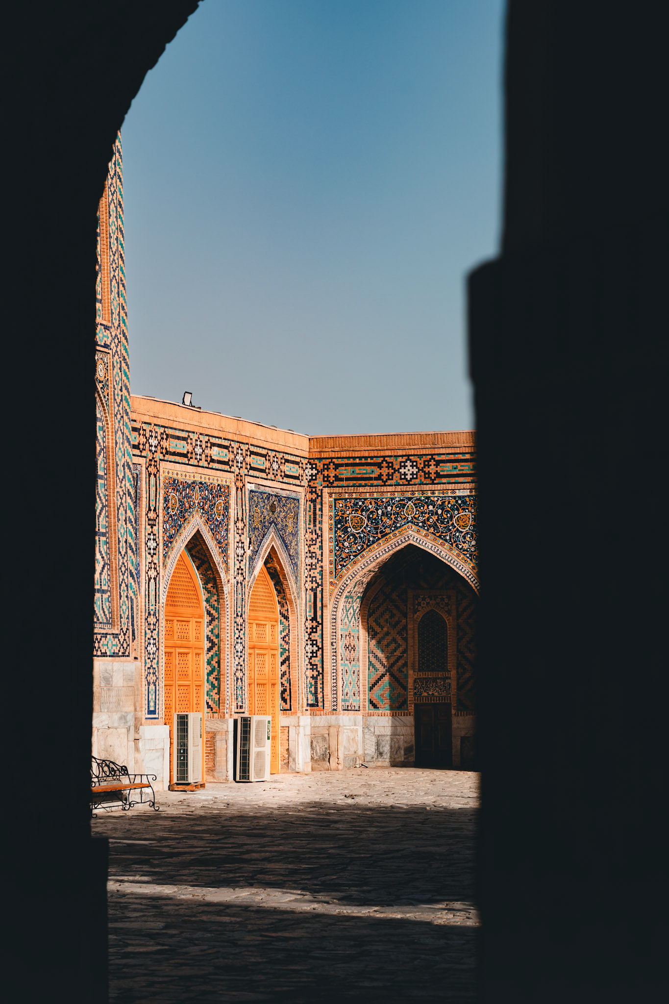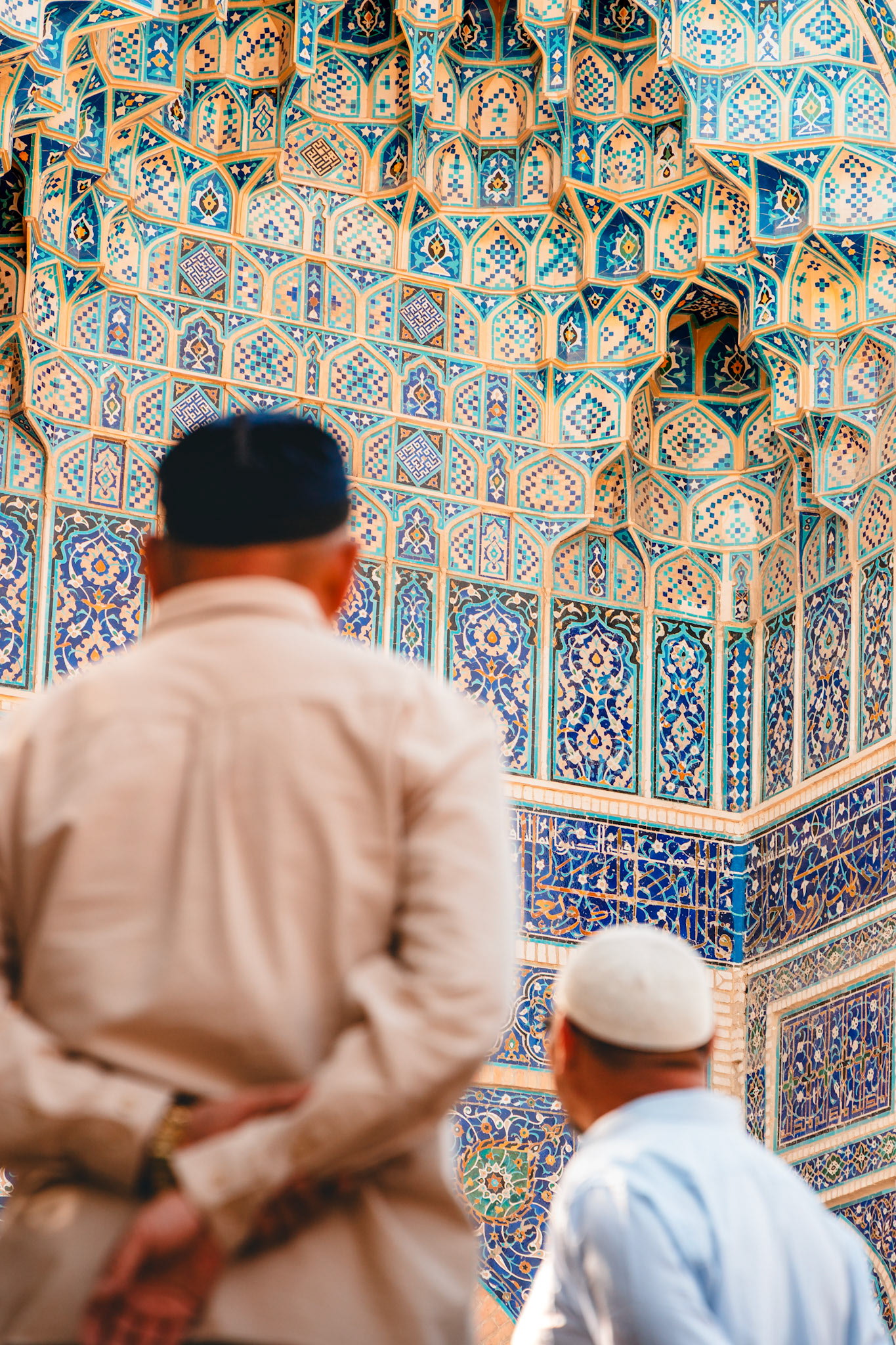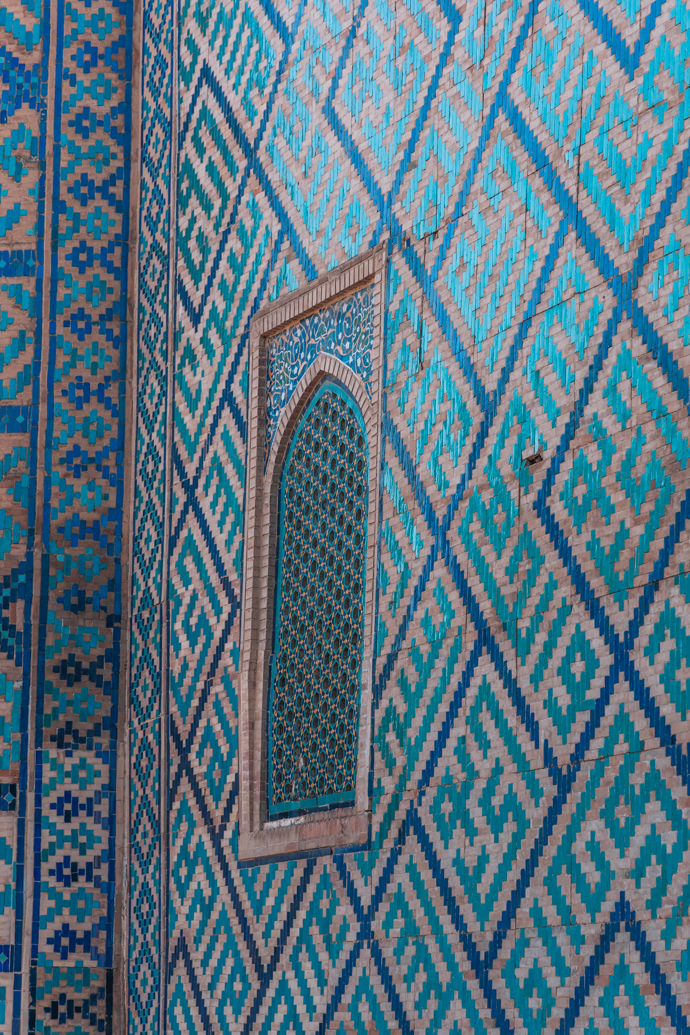 Later die dag dwalen we door Shah-i-Zinda, “de levende koning”. Een smalle laan vol mausolea, waar elke boog en tegel een ander patroon vertelt. Eeuwenoude graven, bedekt met majolica en kalligrafie, weerspiegelen de bloeitijd van de Timuridische dynastie.