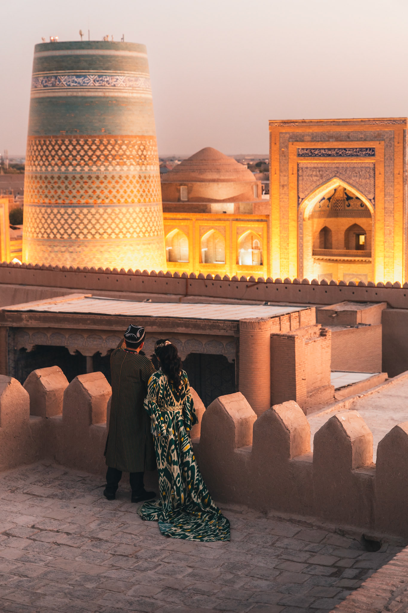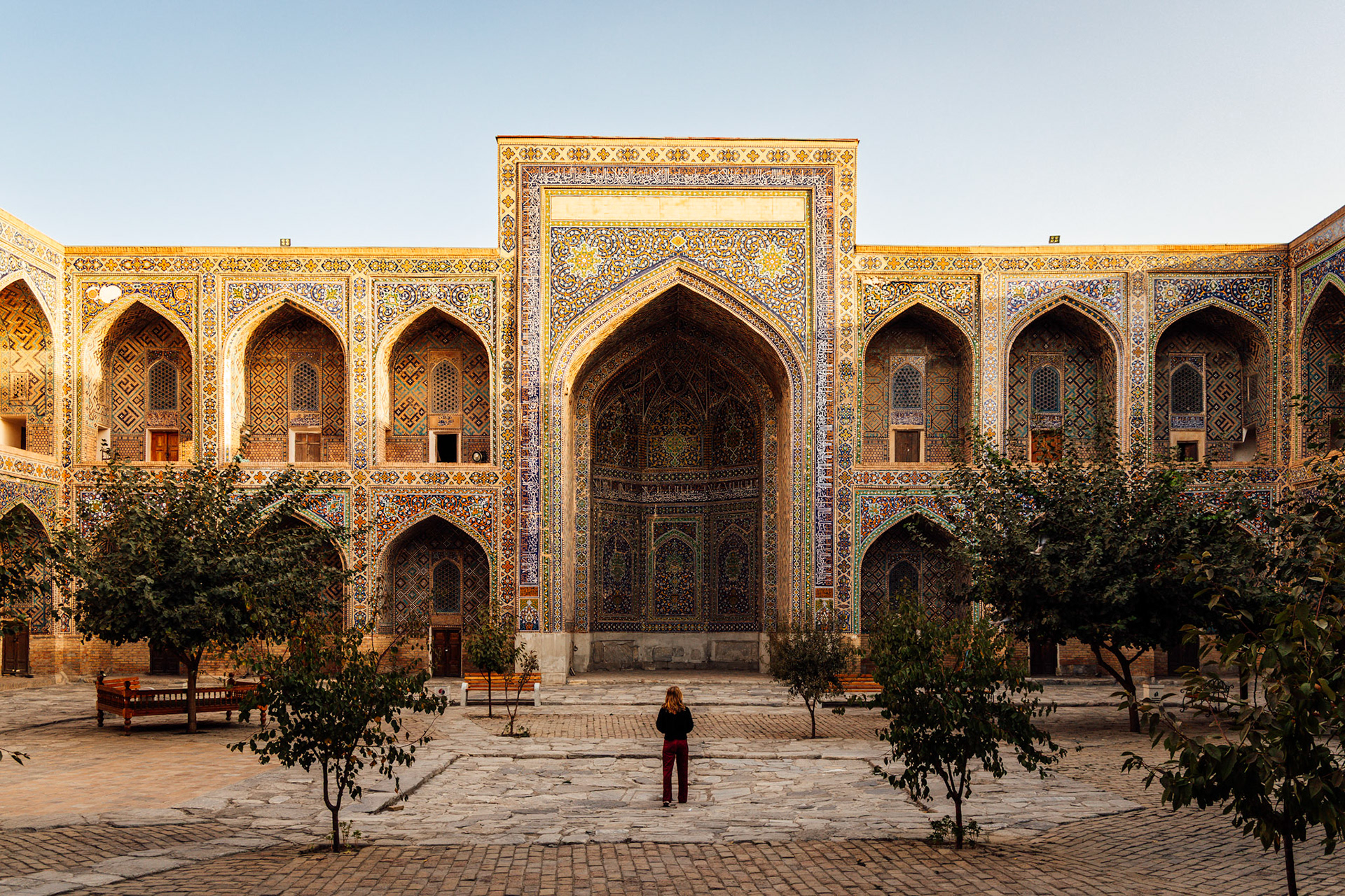 ’s Avonds keren we terug naar het Registan. Waar de ochtend verstild was, schittert het plein nu in goud licht. De koepels gloeien, de lucht is vol geluid, en even lijkt het alsof de tijd zelf even stilstaat om mee te kijken.
