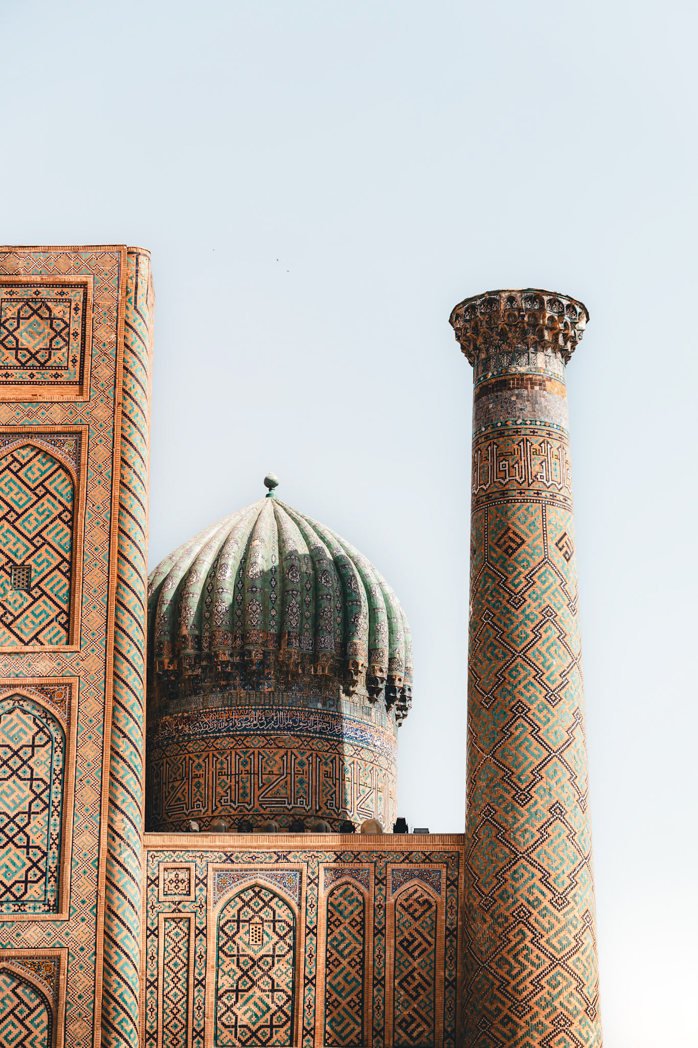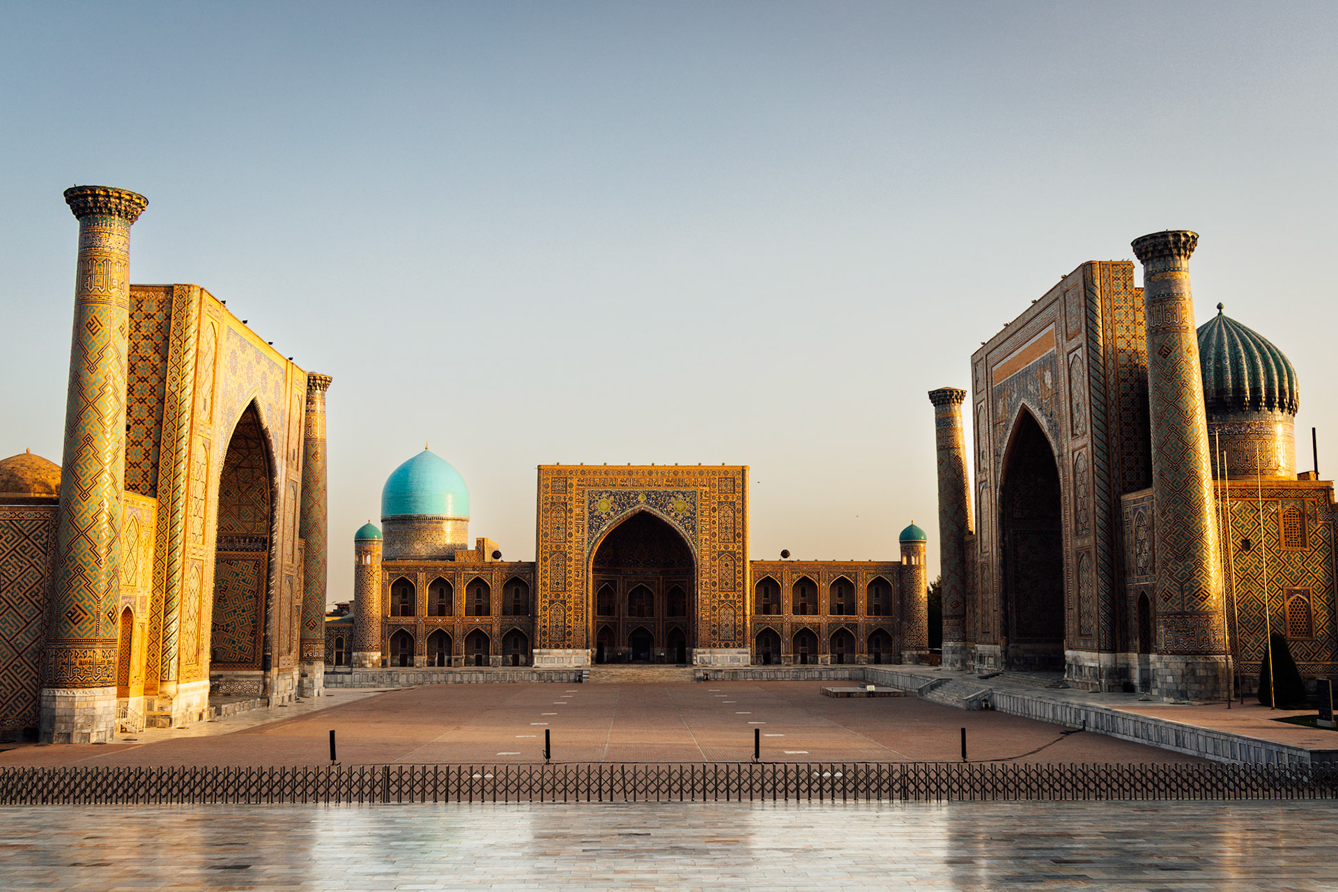 Wanneer we uitstappen, hangt de ochtendlucht zwaar van warmte en stof. De naam alleen al, Samarkand, klinkt als een belofte. We lopen richting het Registan-plein, waar drie madrassa’s bevinden. Elk gebouw is bedekt met duizenden mozaïektegeltjes in blauw, turquoise en goud. Het is nog vroeg. De zon komt net op en raakt de koepels met zacht licht. Alles wat we eerder over deze plek lazen, valt in het niets bij wat we zien.