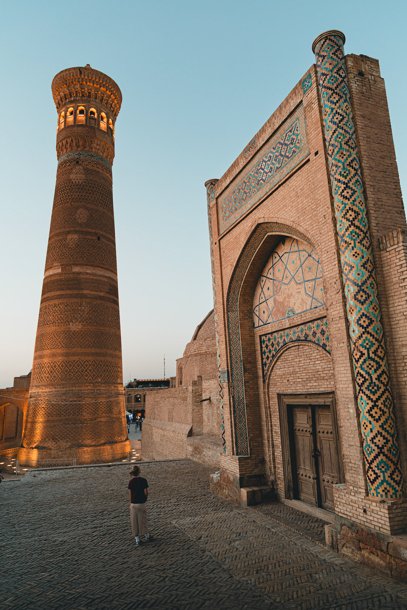 Het Poi-Kalyan-complex is het hart van Buchara. Een minaret van bijna vijftig meter hoog torent boven de stad uit, een vuurtoren van steen die eeuwenlang reizigers de weg wees. Aan haar voet liggen de Kalyan-moskee en de Miri-Arab-madrassa, met tegels die fonkelen als water. Hier staan we even stil. Niet alleen om te kijken, maar om te luisteren.